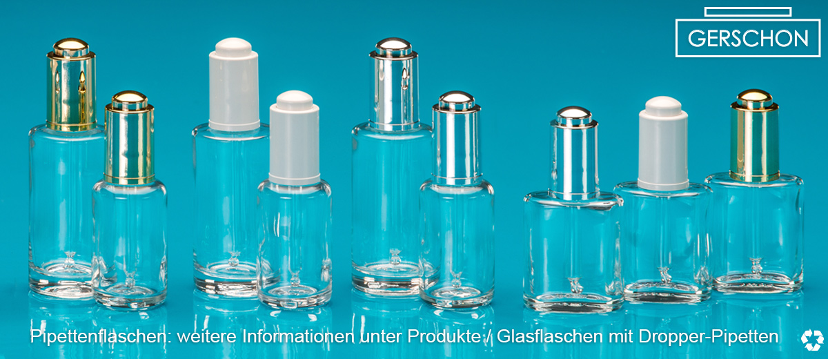 Gerschon bietet in seinem umfangreichen Standardsortiment verschiedenste Pipettenflaschen für Ihre Essenzen, Extrakte, Öle oder Parfums an. Für pharmazeutische, aber auch kosmetische Produkte können Sie bei uns unter anderem Glasflaschen mit Dropper-Pipetten und Originalitätsverschluss erhalten. Statt dem traditionellen roten Gummi bekommen Sie bei uns weiße und schwarze Varianten.